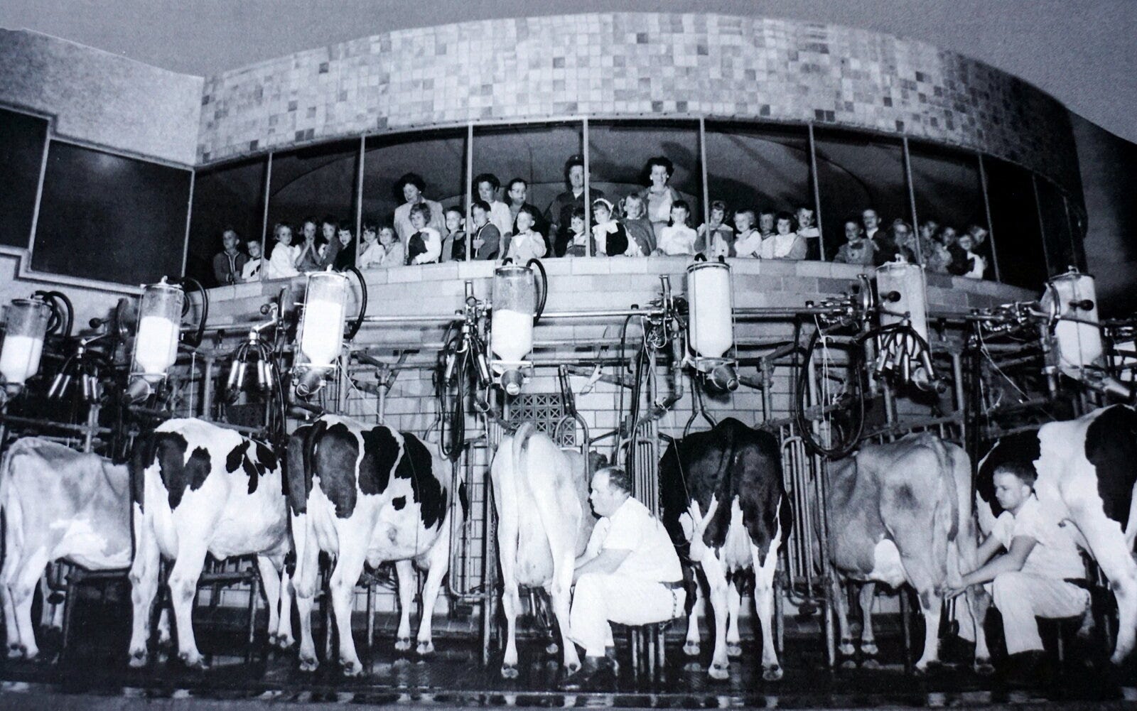 Cleanliness was ever a constant protocol. The cows were pre-washed with warm water prior to entering the milking parlor. There they were toweled by attendants in white uniforms, attached to sterilized stainless steel milkers, and the milk fed to Pyrex glass containers and delivered through stainless steel pipes to the bottling plant adjacent to the milking platform.